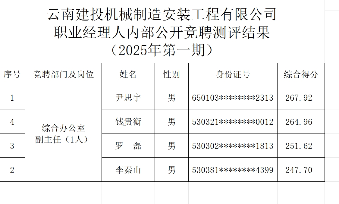 附件:云南建投機械制造安裝工程有限公司職業(yè)經理人內部公開競聘測評結果公示(2025年第一期)